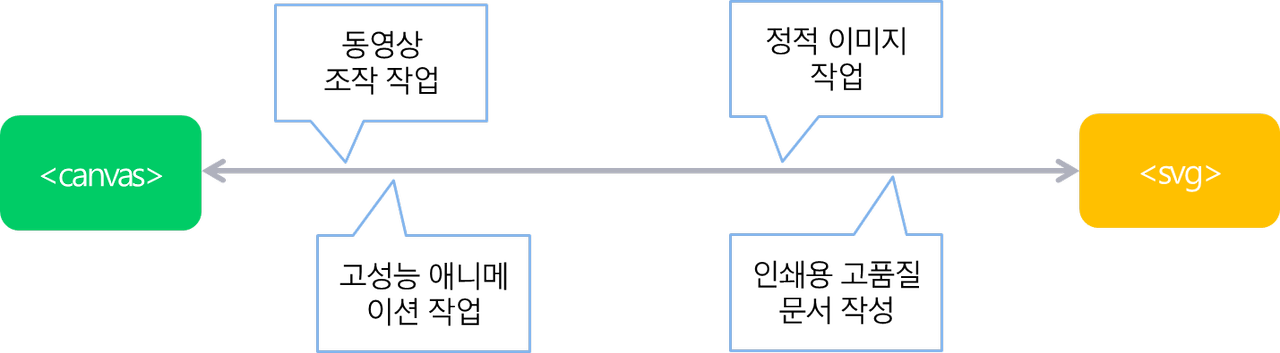- 고품질의 문서 작업이나 정적 이미지의 조작 작업: svg 추천